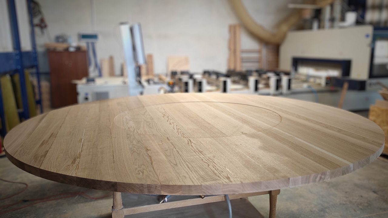 Produkujemy blaty okrągłe bukowe, dębowe, jesionowe z litych lameli (nie łączone na długość). Oczywiście możemy je też zrobić z innego gatunku drewna. Nasze drewniane blaty robimy zawsze na zamówienie, dzięki czemu możemy dobrać zarówno średnicę, jak i grubość. Dzięki temu, że posiadamy centrum obróbcze CNC, możemy również zrobić fazowanie lub wyfrezować otwory pod wzmocnienia czy nogi.