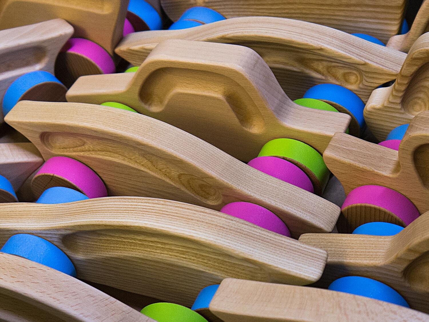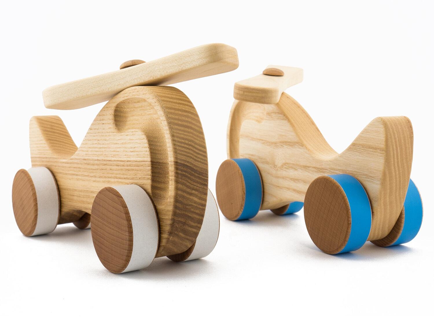 Jeden z naszych pierwszych projektów zabawek, czyli drewniane autka i helikoptery z drewna bukowego i jesionowego.